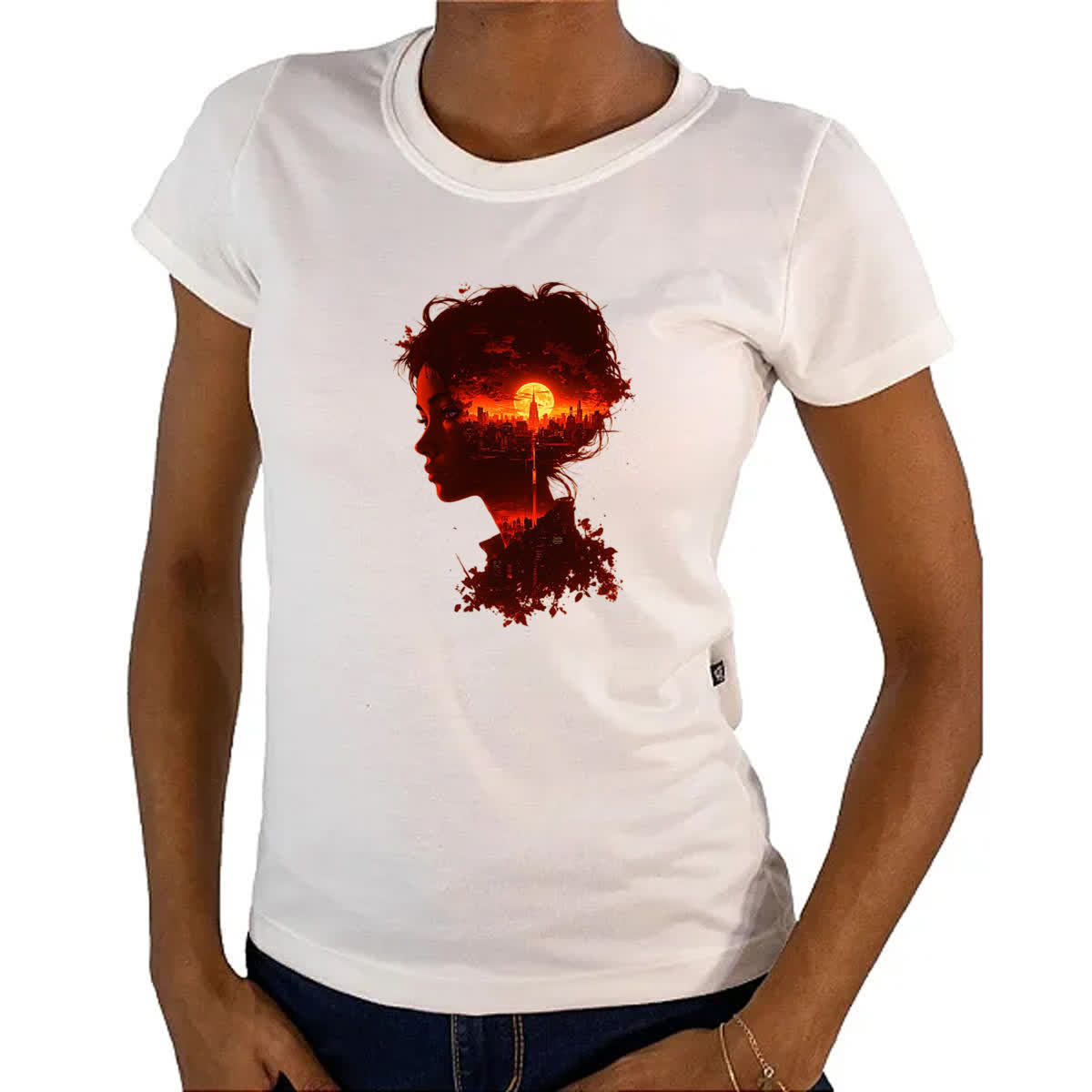 Camiseta Baby Look Silueta feminina sunset red art