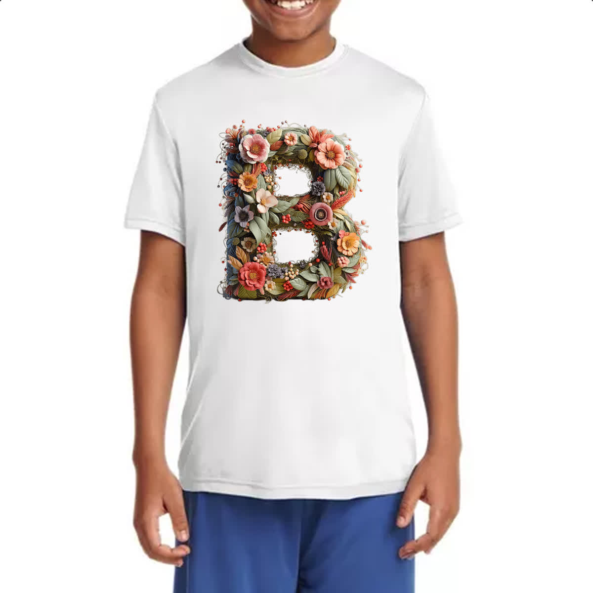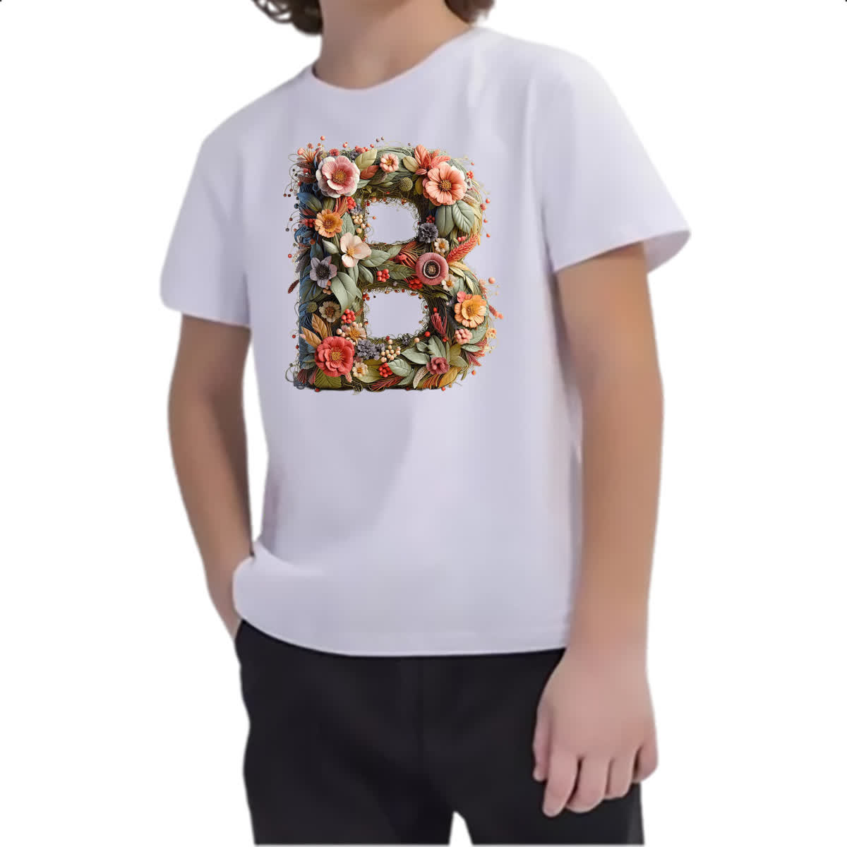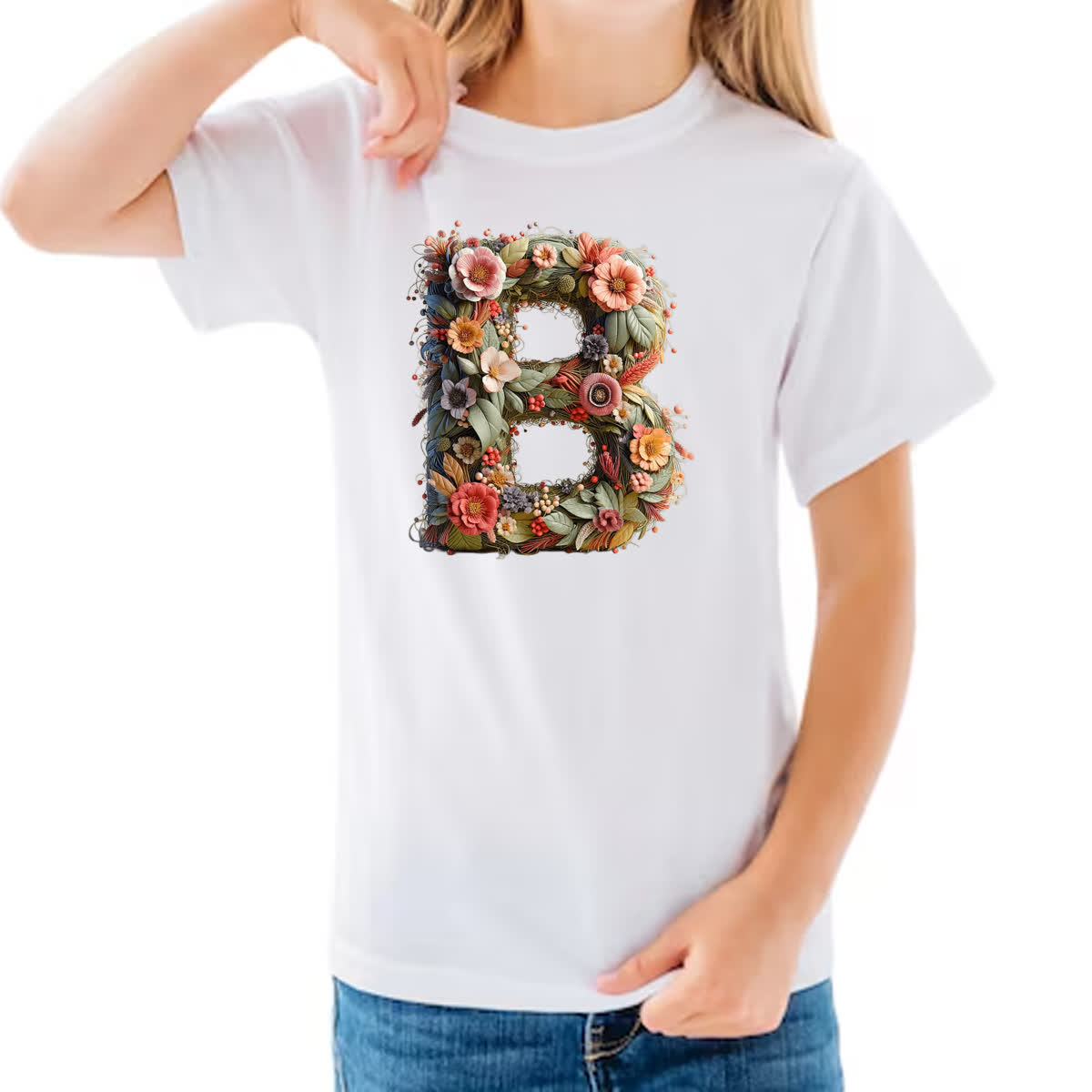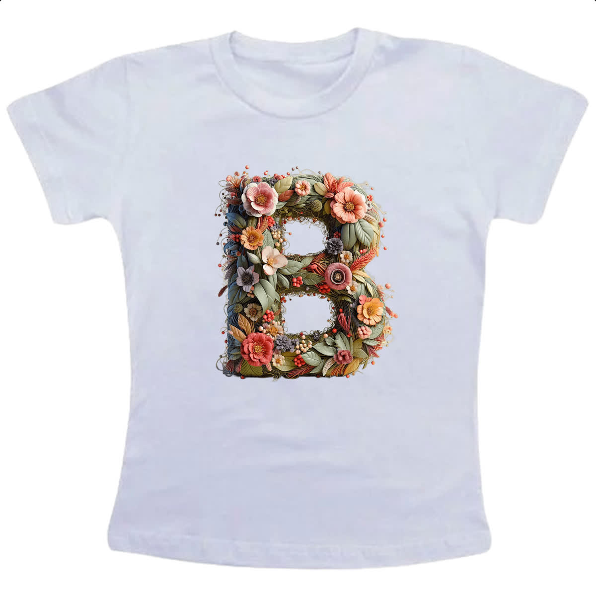 Camiseta Infanto Juvenil Alfabeto Floral Letra B