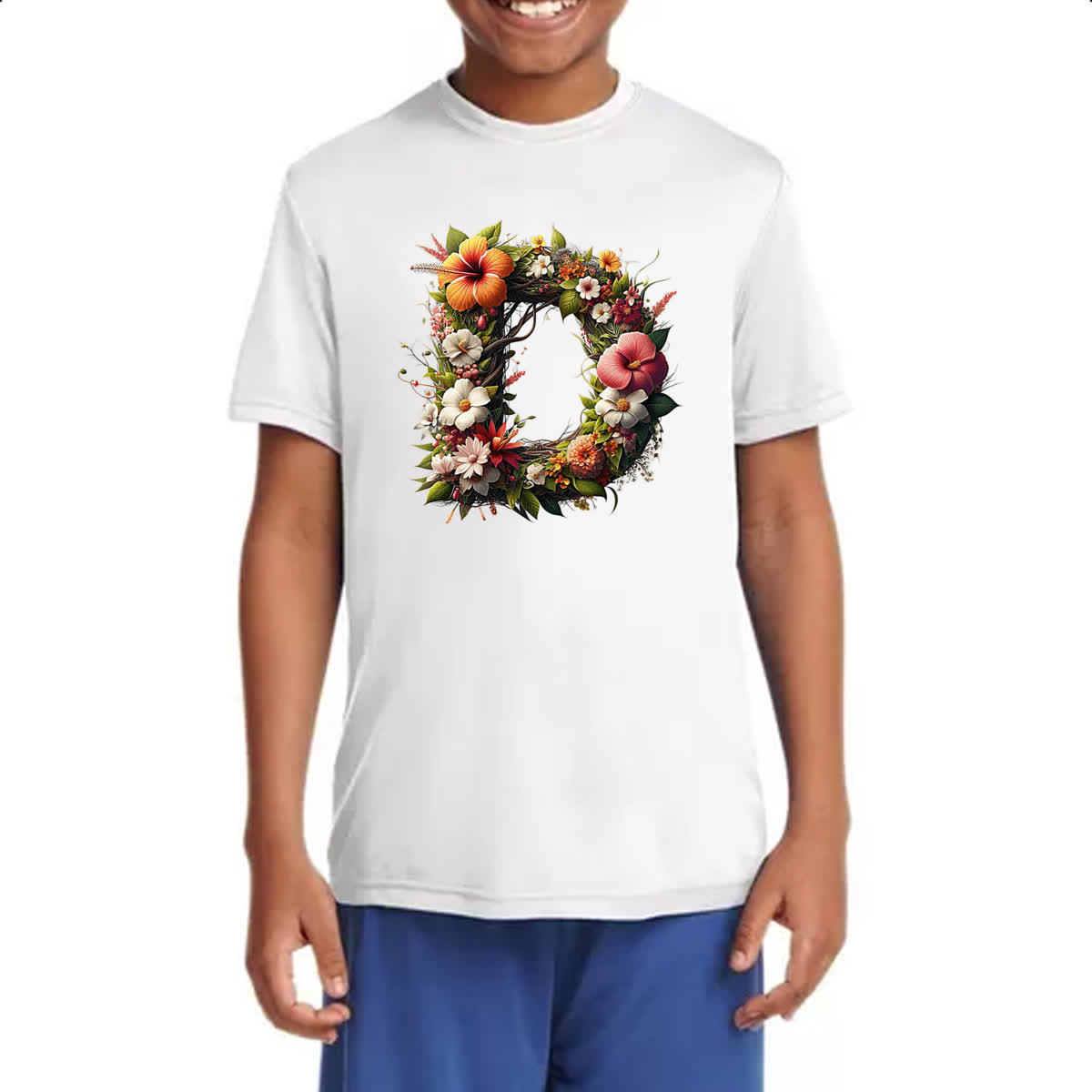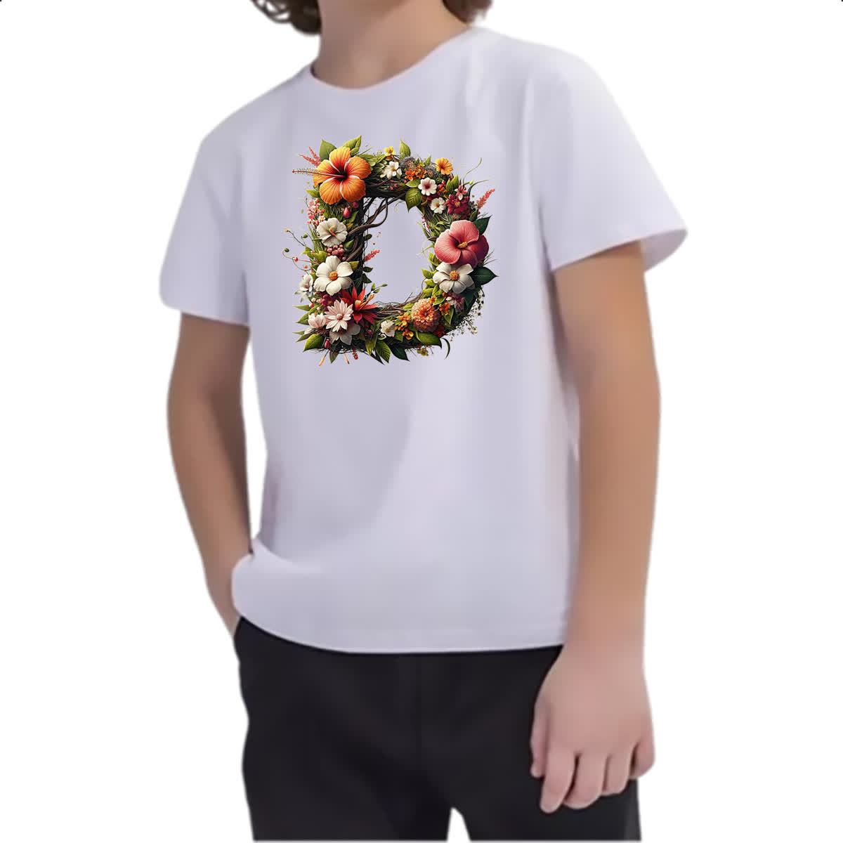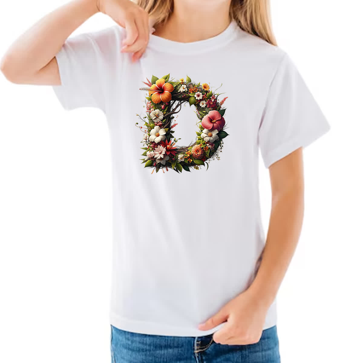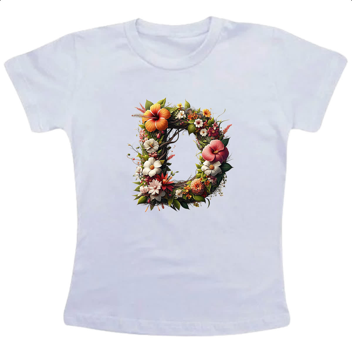 Camiseta Infanto Juvenil Alfabeto Floral Letra D