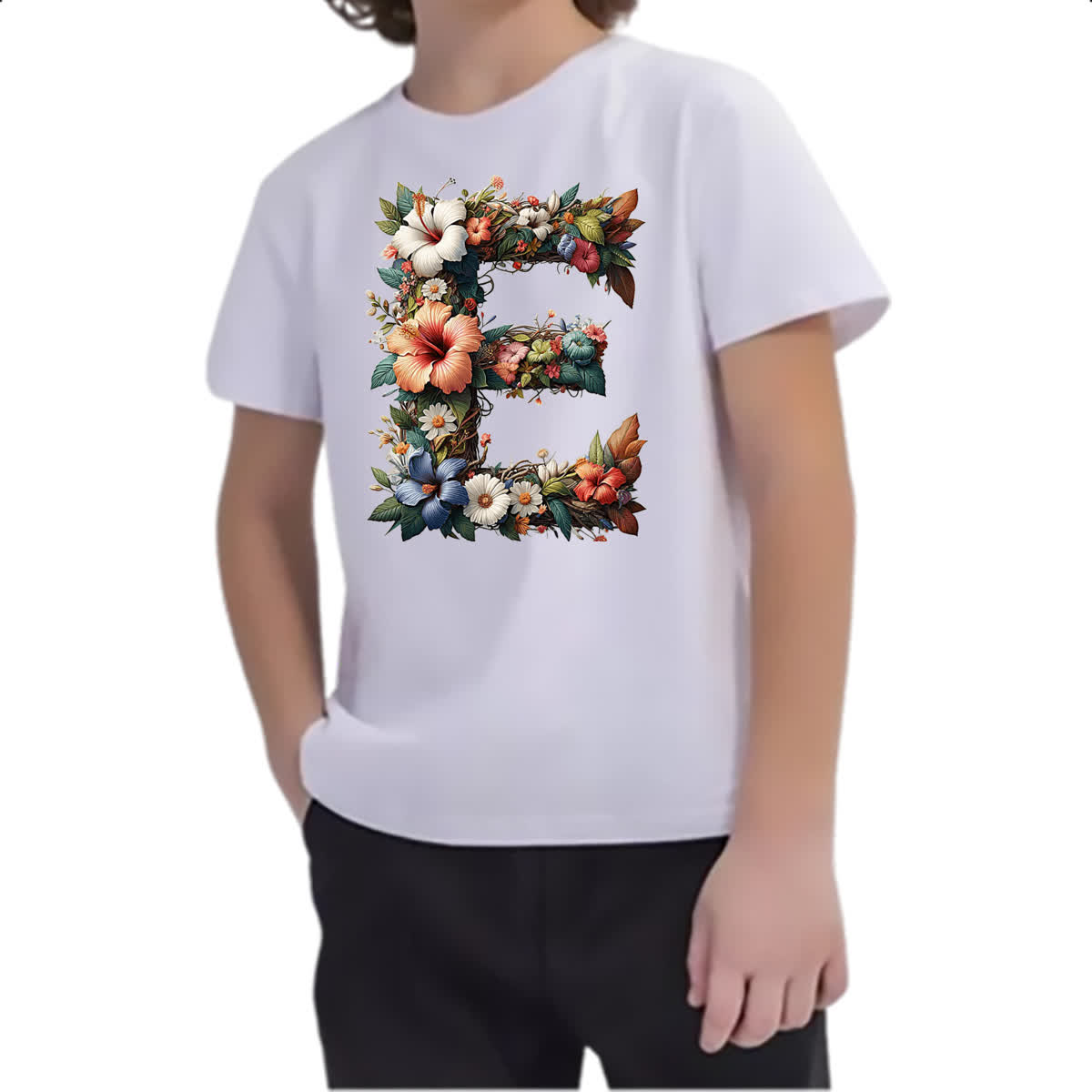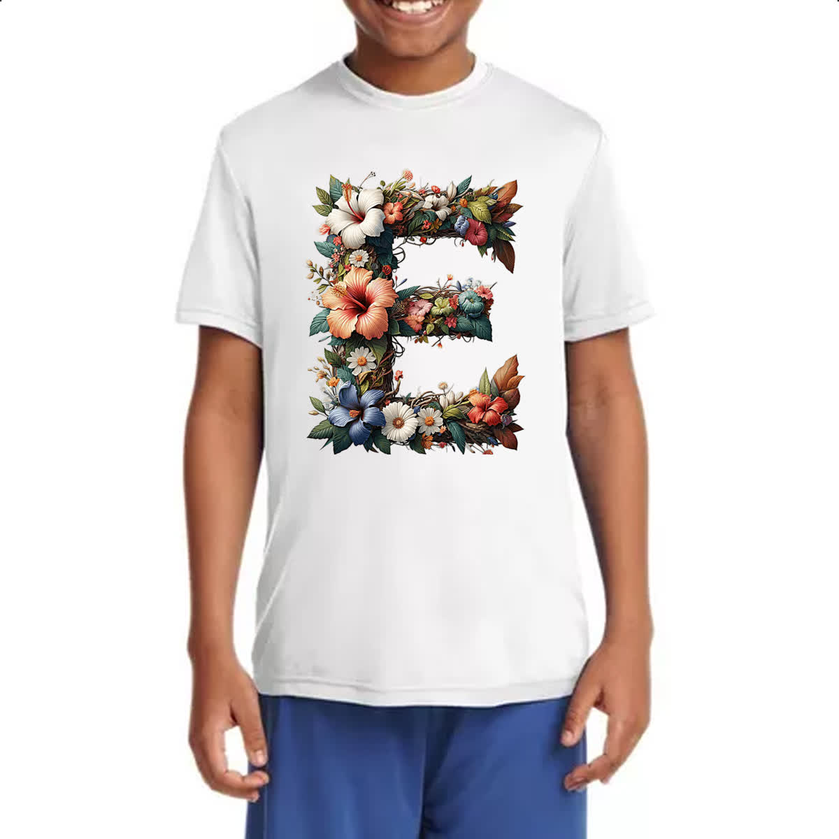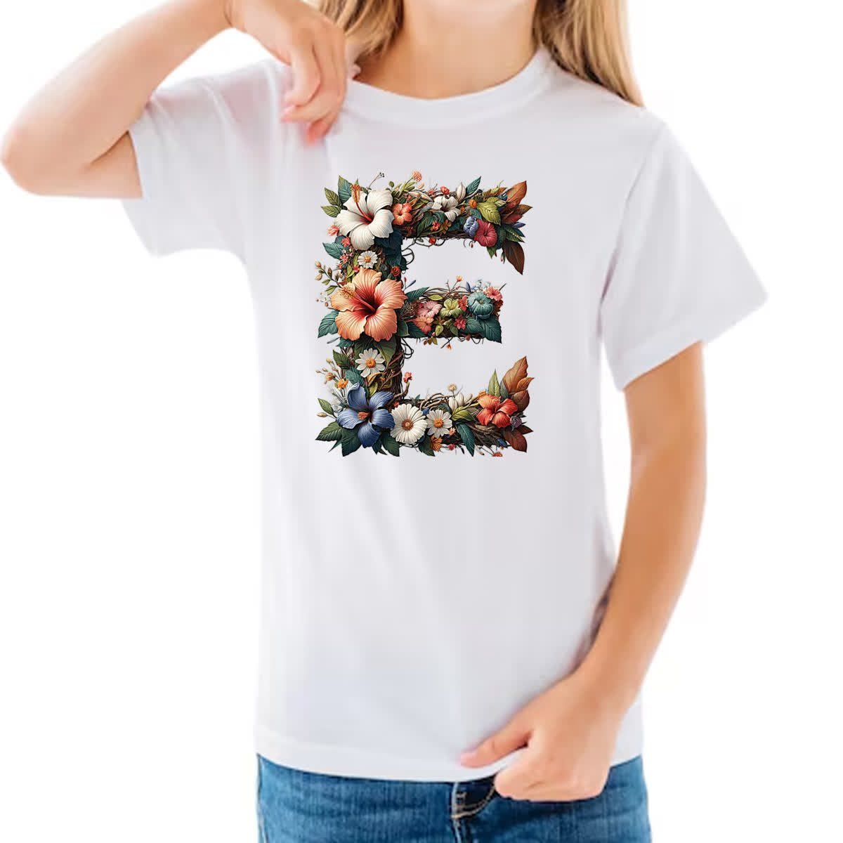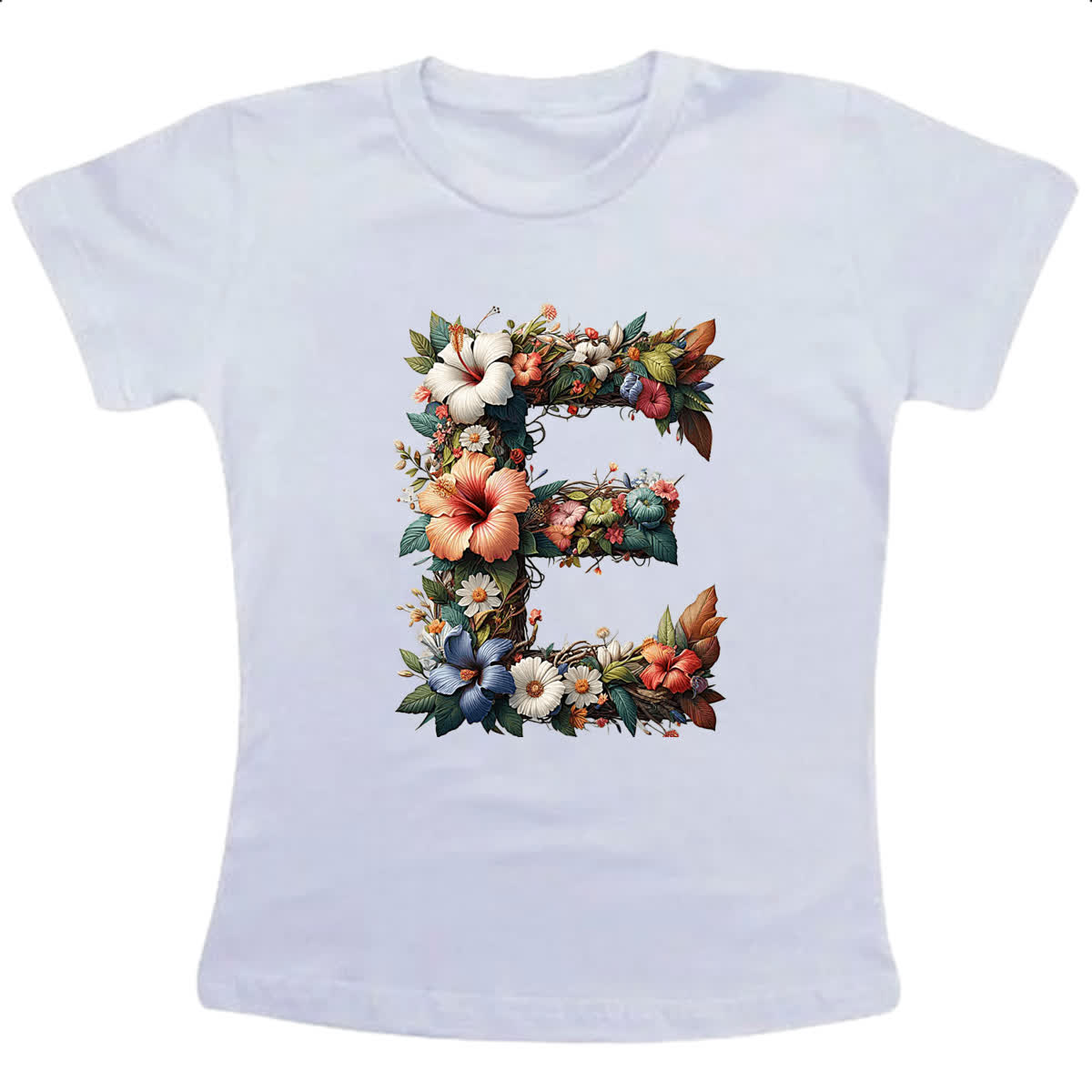 Camiseta Infanto Juvenil Alfabeto Floral Letra E