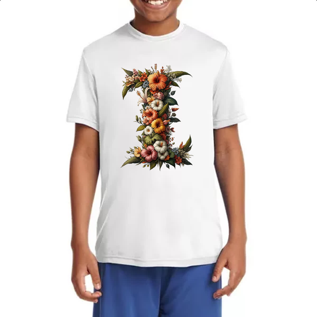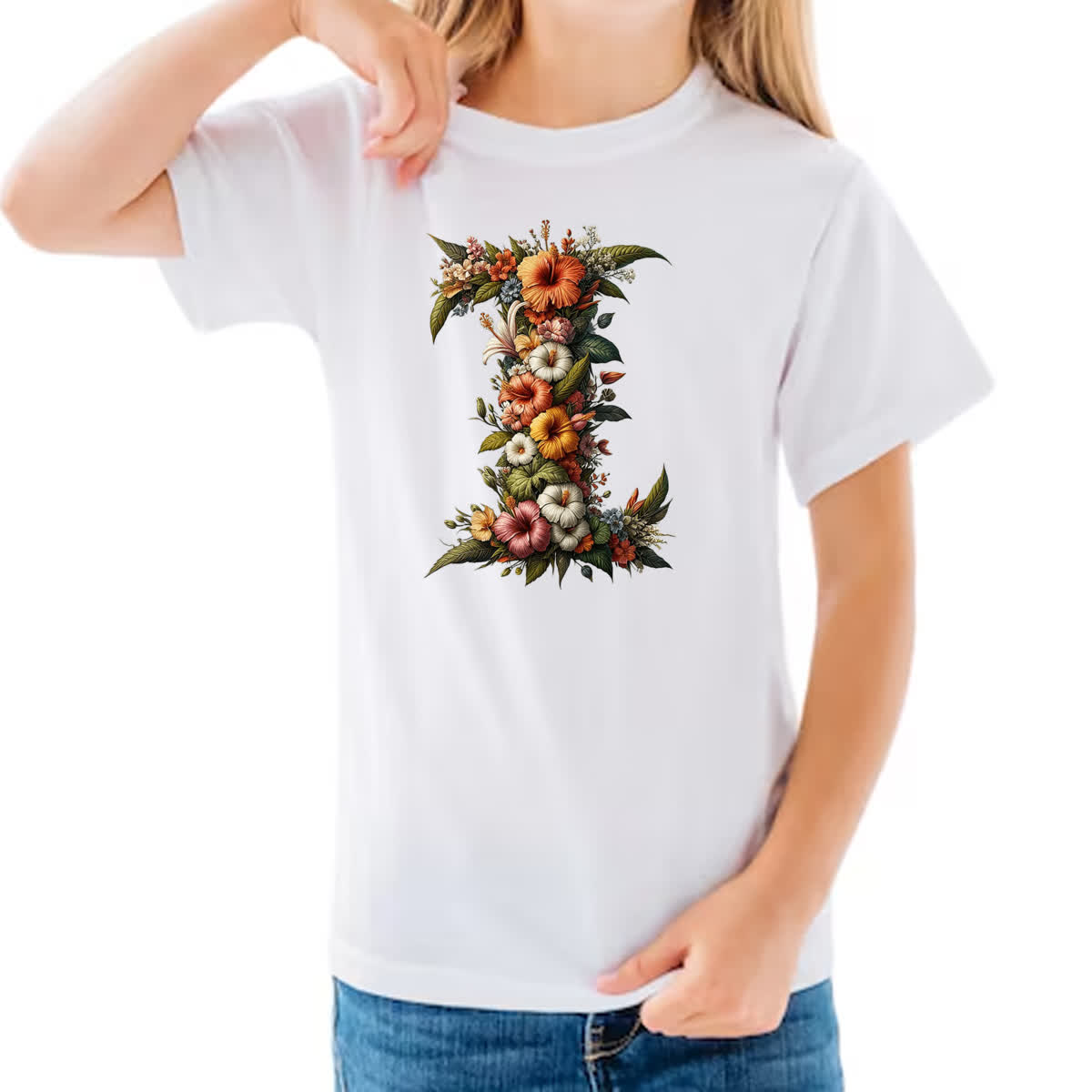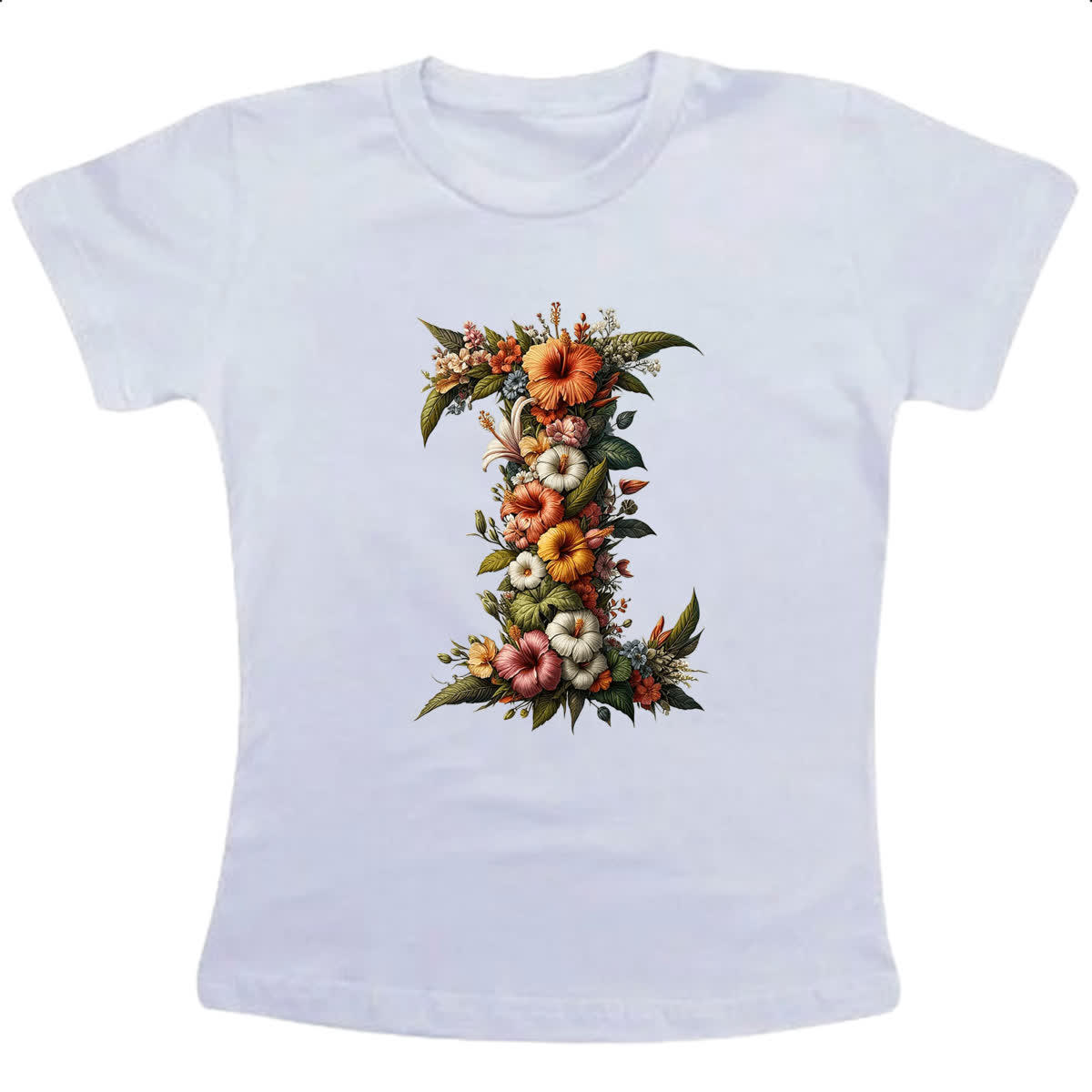 Camiseta Infanto Juvenil Alfabeto Floral Letra I