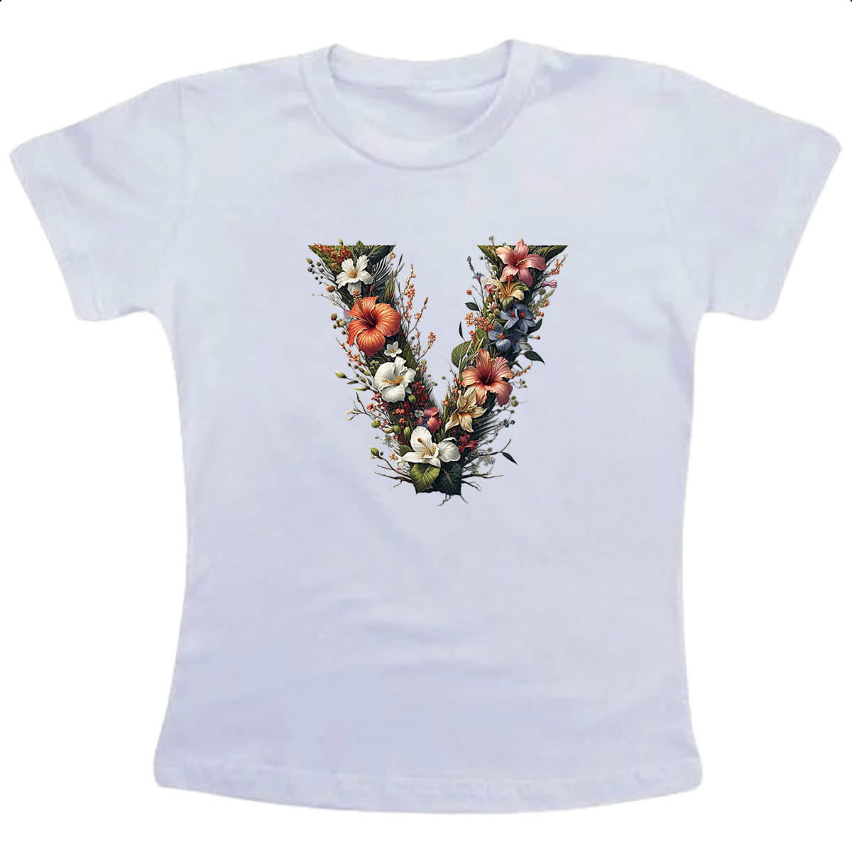 Camiseta Infanto Juvenil Alfabeto Floral Letra V