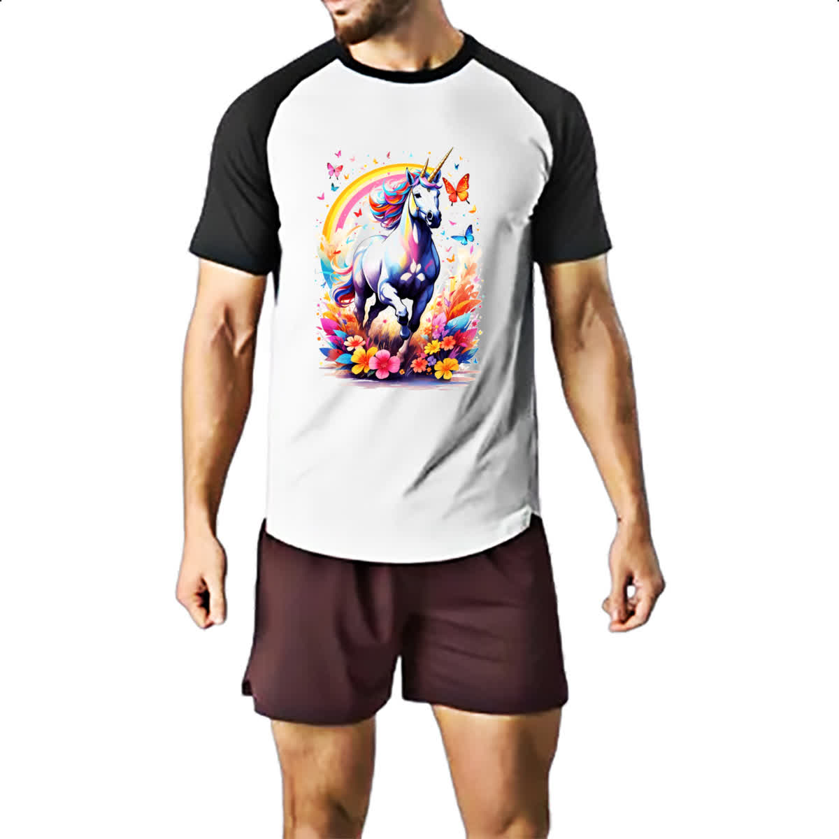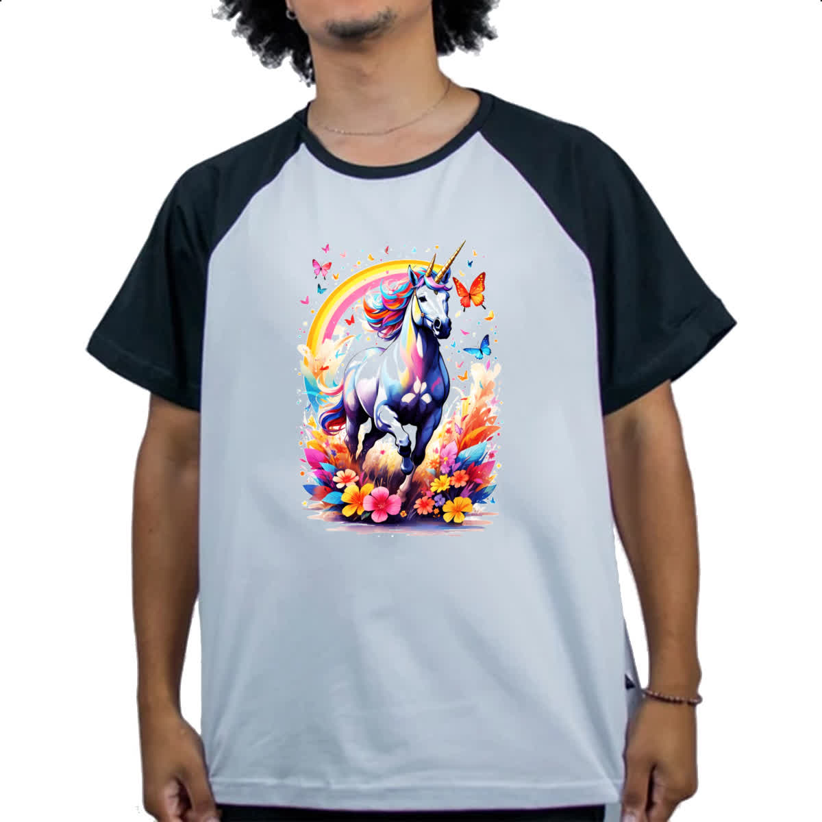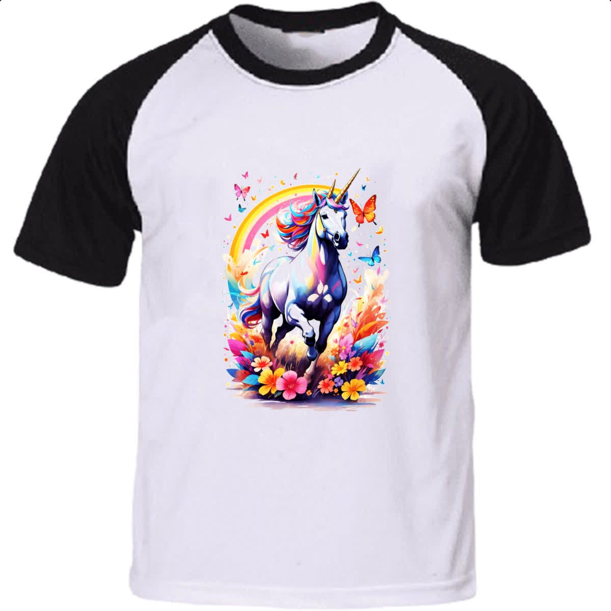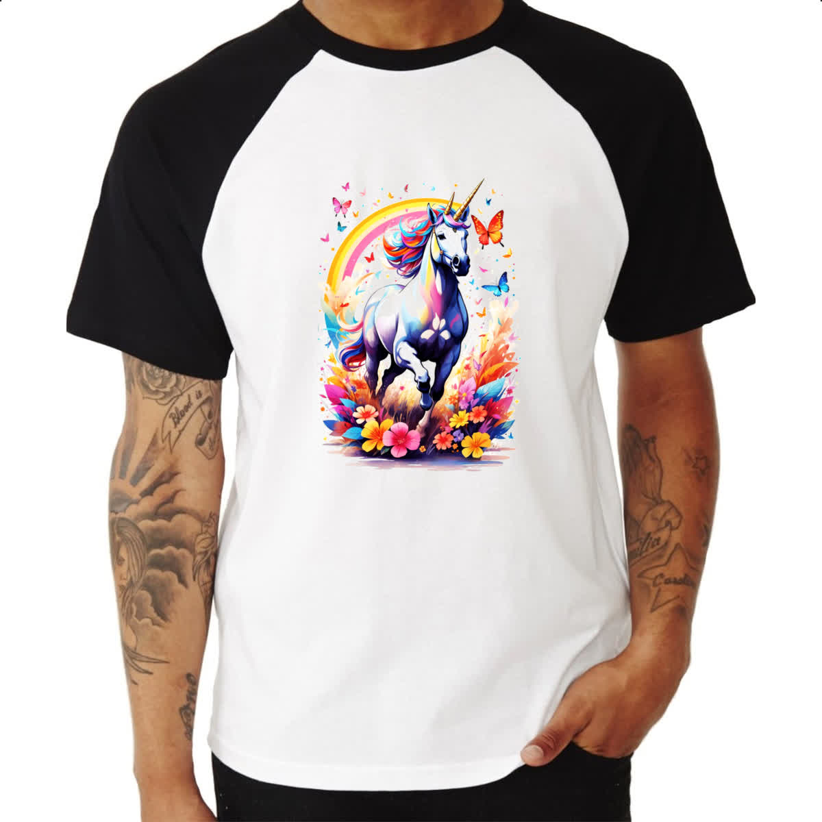 Camiseta Raglan Unicornio correndo ao arco-iris