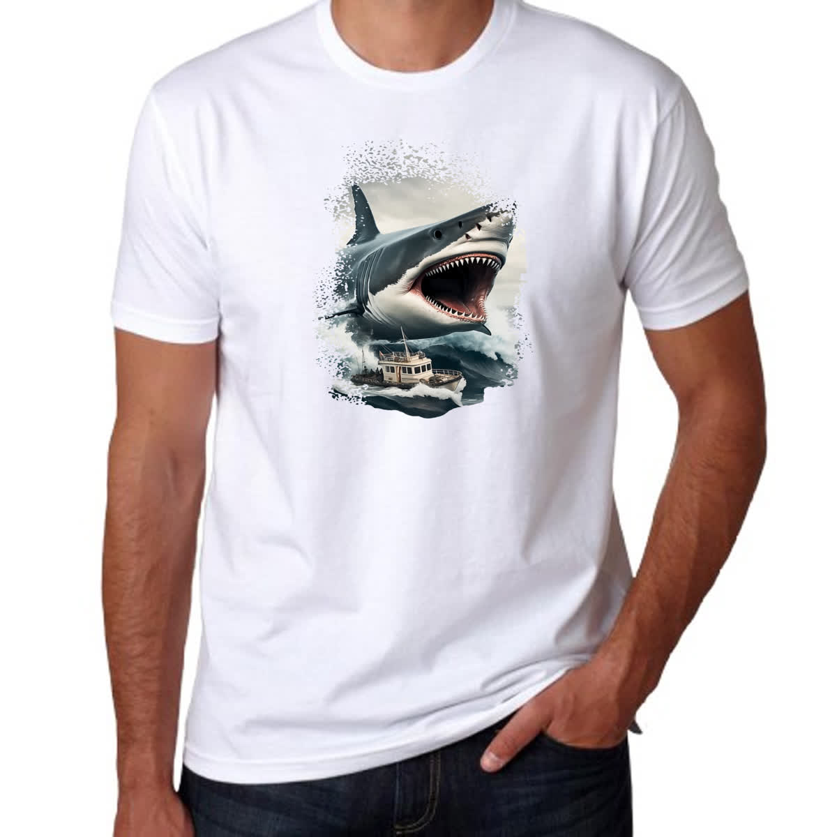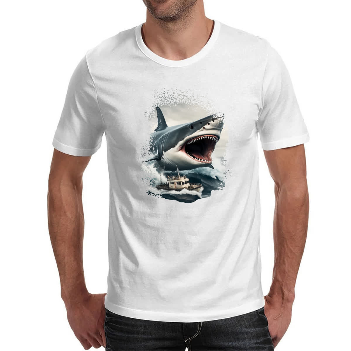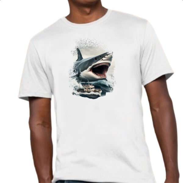 Camiseta Unissex Megalodon atacando embarcacao